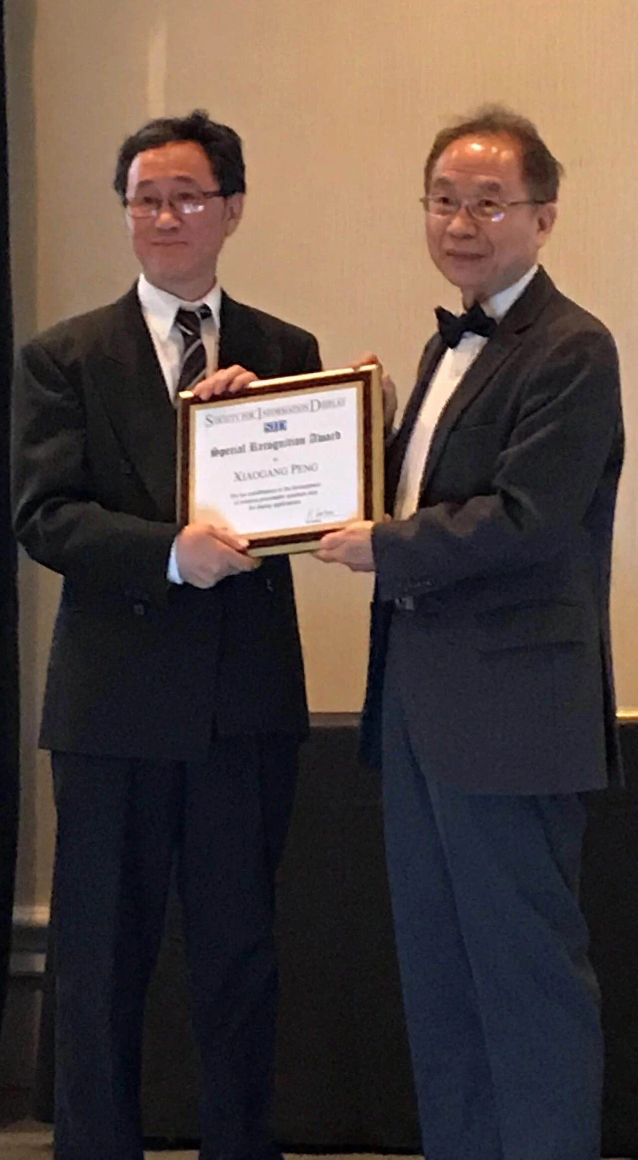 SID荣誉与奖项委员会主席吴诗聪教授(右)颁发给王东升先生(左)David Sarnoff产业成就奖