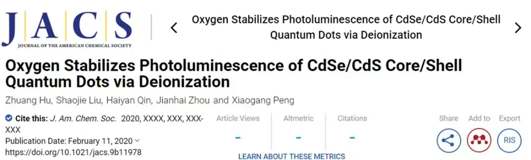 Zhuang Hu et al. Oxygen Stabilizes Photoluminescence of CdSe/CdS Core/Shell Quantum Dots via Deionization,J. Am. Chem. Soc. 2020