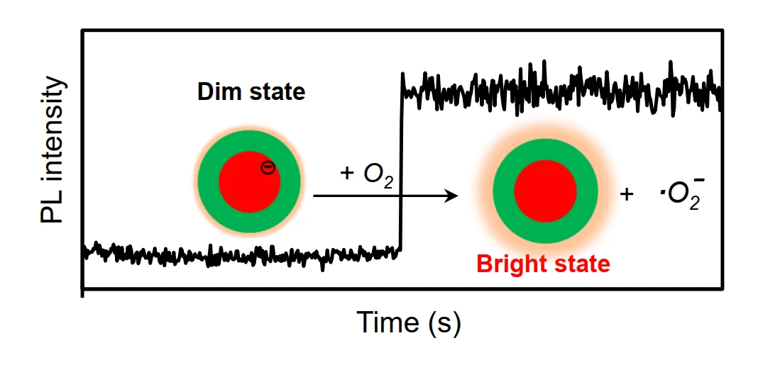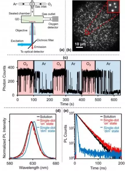 1)在光激发过程中,如果系统中有足够的氧气,则各种形式的核/壳量子点将被及时去离子化,从光生和低效的三元态恢复为有效的单激子态,超氧自由基为还原产物氧气在给定的激发功率下,自发去离子通道和光电去离子通道的速率都通过增加氧气压力而增加,但是QD的光电离几乎不受氧气压力的影响。