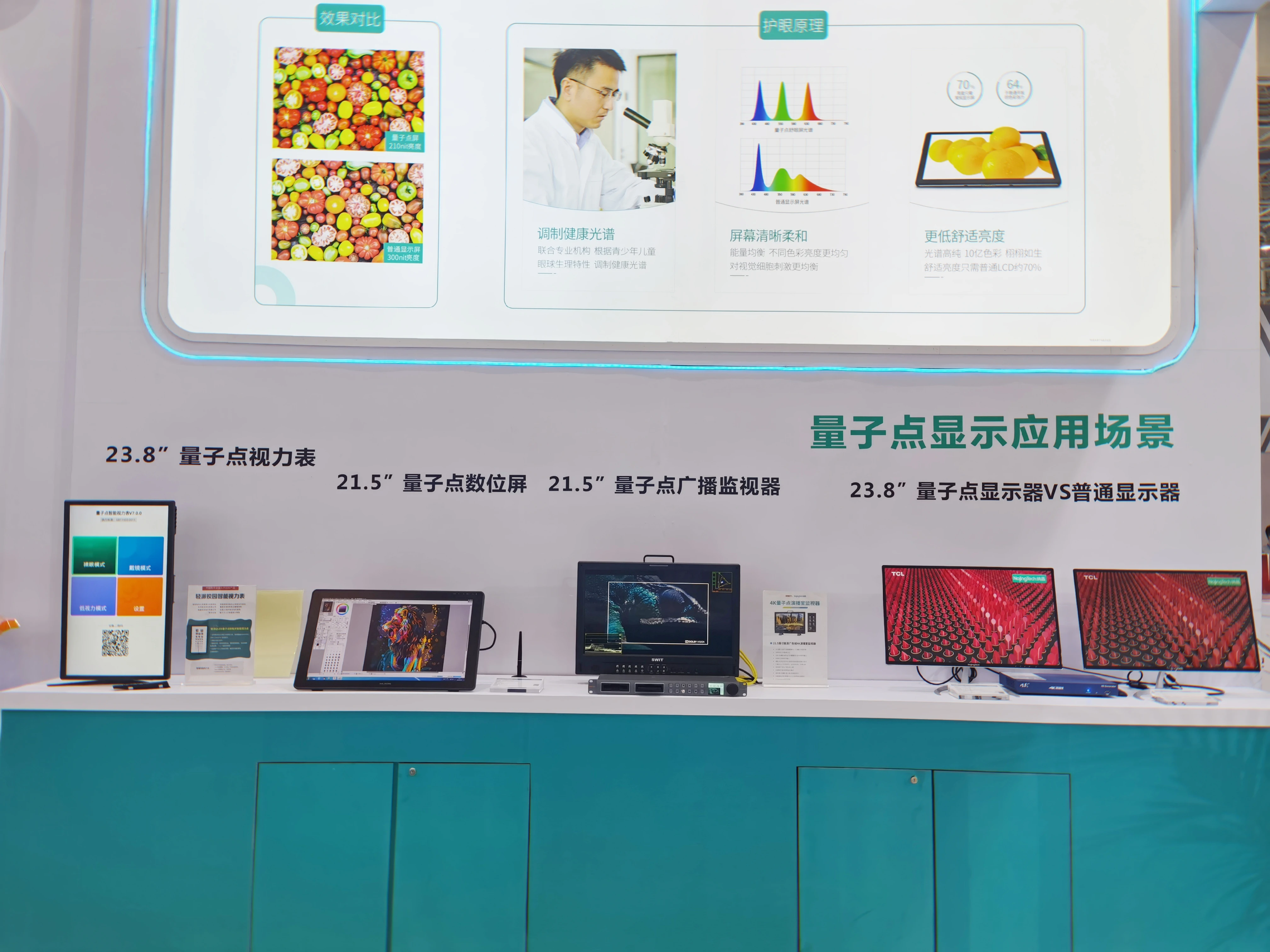 此外,纳晶科技还展示了23.8英寸量子点显示器、21.5英寸量子点广播监视器、21.5英寸量子点数位屏、23.8英寸量子点智能视力表等产品,吸引了众多参观者的目光。除护眼之外,量子点显示屏还具有色域广、精准还原色彩等特点,可大幅提升普通液晶屏画质,具有丰富的应用场景,可广泛应用于教育平板、电子班牌、教育白板、教育直播/录播设备等领域。