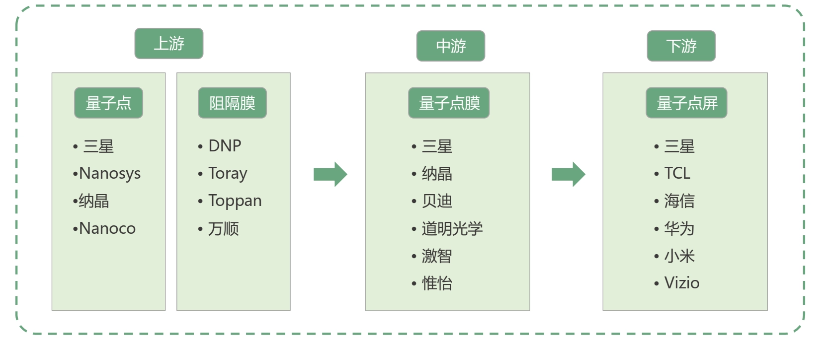 量子点材料和阻隔膜供应商:负责量子点材料和阻隔膜的设计和生产,量子点材料的代表性企业有三星(委托韩松化学生产)、Nanosys、纳晶科技;阻隔膜的代表性企业有DNP、Toppan、Toray和万顺。