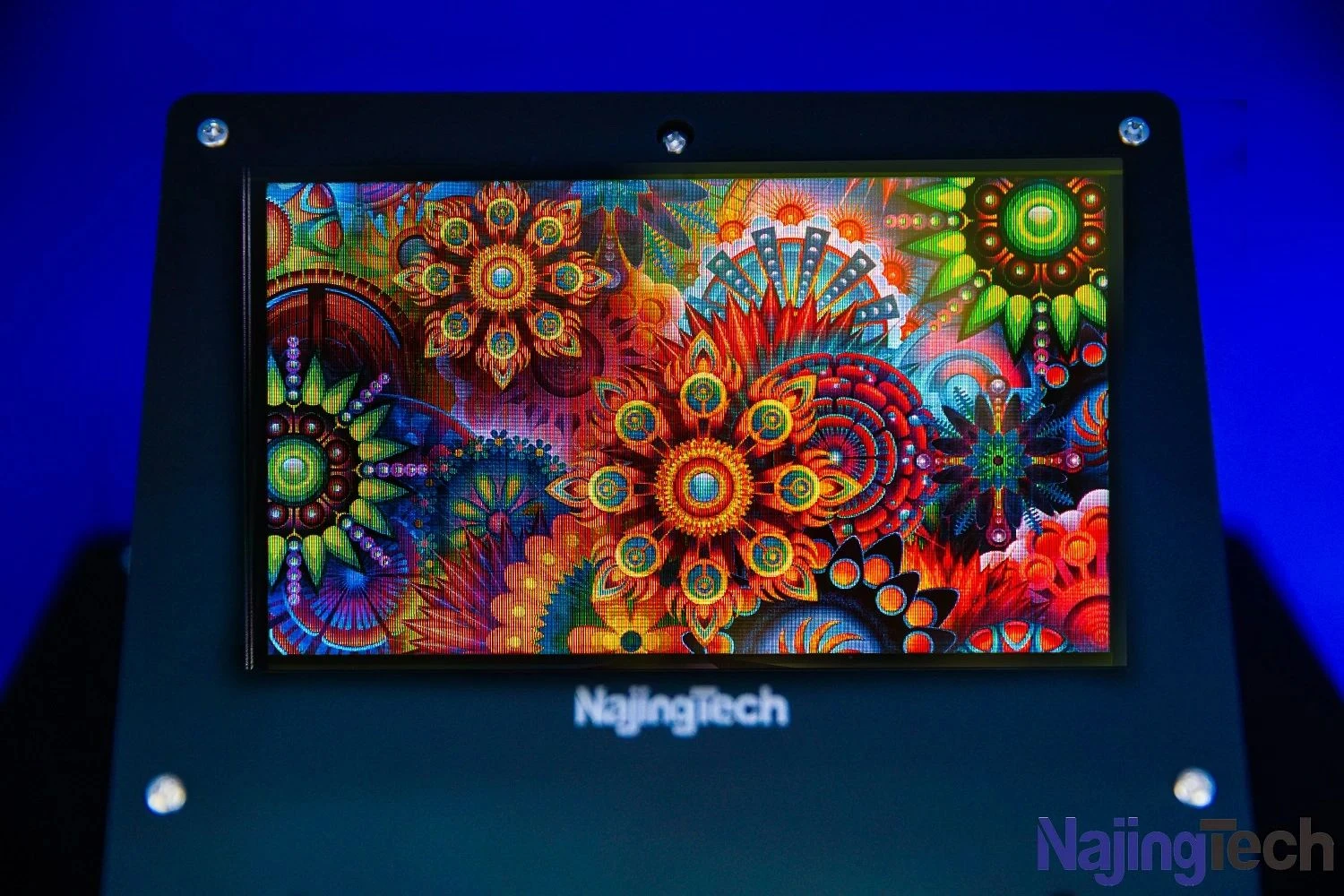 纳晶首次展出的5.5英寸150ppi喷墨打印AM-QLED显示屏,与量子点光致发光技术不同的是,AM-QLED显示屏基于量子点“电致发光”原理,无需背光源,实现真正的“主动式量子点自发光全彩显示”。这款DEMO的峰值亮度可达1000nit,色域达到115% NTSC,吸引了众多观众驻足参观。
