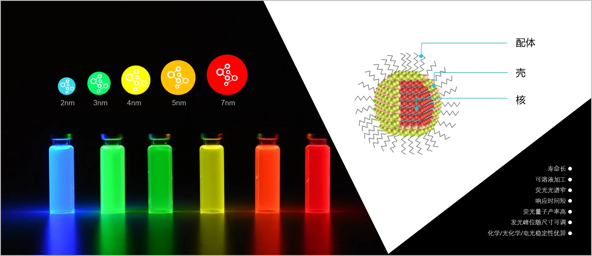 量子点的发射光谱可以通过改变量子点的尺寸大小来控制。通过改变量子点的尺寸和它的化学组成可以使其发射光谱覆盖从蓝光到红光的整个可见光区。量子点的荧光发射光谱具备超窄半峰宽,因此其具备超高色纯度,可以展现出极致的色彩表现力。
